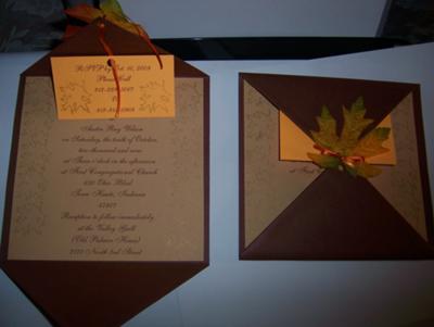 My fiance and I are getting married Oct. 10th of this year and are doing a fall themed wedding. I wanted something different than all the other monogrammed, pocketfold, etc. invitations. Which by the way I think are Beautiful, just couldn't afford to buy them myself so I decided to make my own. I bought 12"x12" Scrapbooking paper called Autumn Memories. I cut the brown sheets in half to use for the outside of the invites and then folded the ends to a point, cutting holes at the points for the ribbon. I then took the cream/kinda tan colored paper and cut it into 6x6 squares and just used microsoft word to print the info on them. I used orange paper for my RSVP's, which are about the size of a business card. Since I didn't have a pocket or anything to put them in, I just hole punched the top and ran the same ribbon through it that I did the rest of the invite. I went to hobby lobby and bought the leaf stamp and gold ink and stamped both sides of the invite and on each side of the rsvp. Once I got the ribbon through I hole punched a silk leaf and tied it all together! |